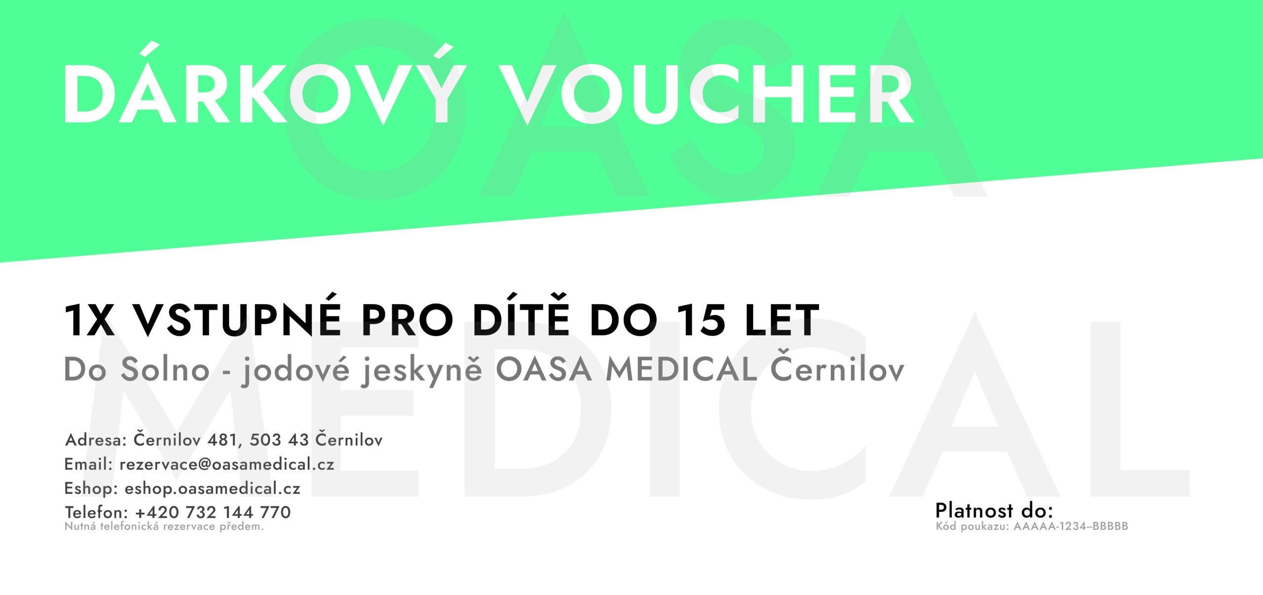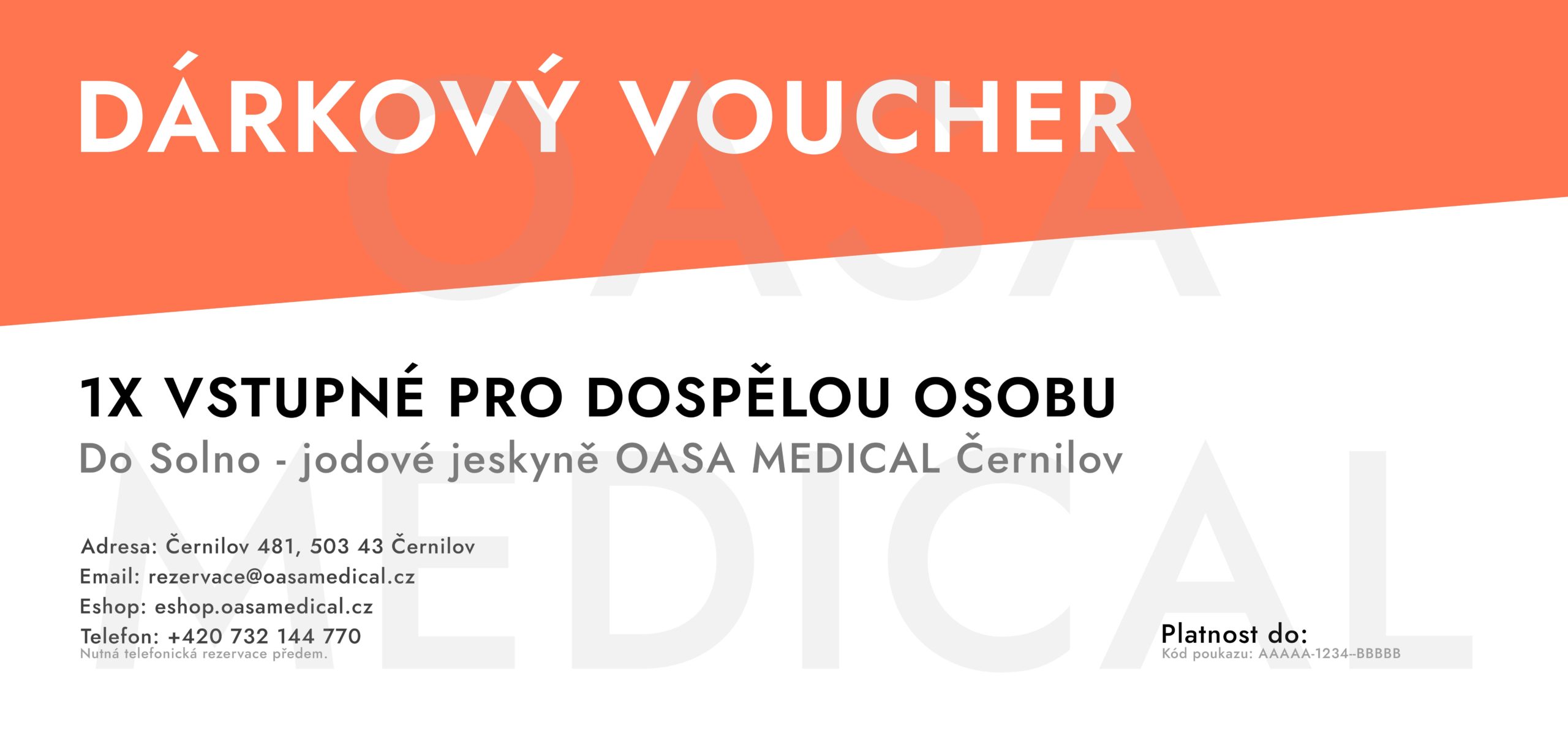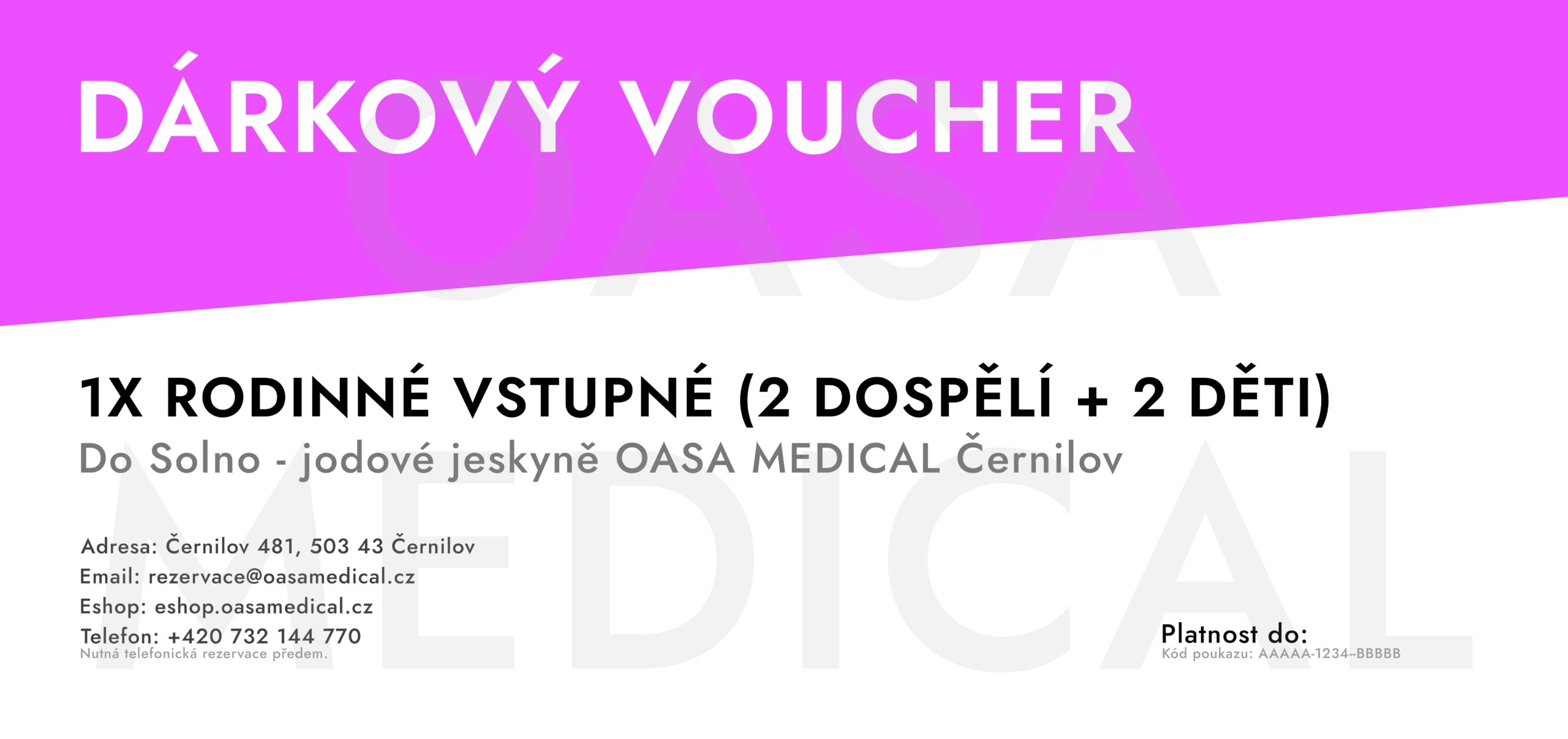 Darujte jako dárek voucher do solné jeskyně OASA MEDICAL v Černilově. Na výběr jsou varianty – 1x rodinné vstupné (2 dospělí + 2 děti do 15 let), 1x vstupné pro 2 dospělé osoby, 1x dospělá osoba a 1x zvýhodněné vstupné (dítě 6-15 let, důchodci, ZTP).